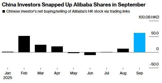 今年截至目前,中国内地投资者在 9 月份共购入了价值 610 亿港元(约合 78 亿美元)的阿里巴巴港股(以净买入计算),这是今年以来单月买入量最大的一次。